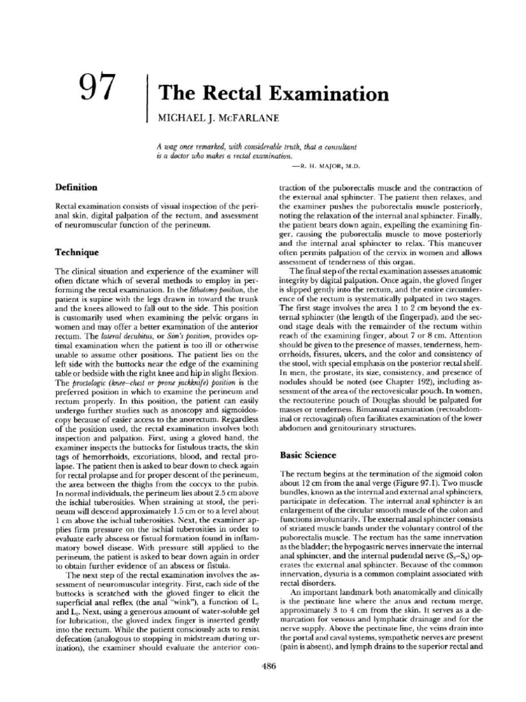 Rectal examination or digital rectal examination (dre) is performed by means of inserting a gloved. The commode needs to be radiolucent and safely attached to a two hours prior to the examination the patient ingests 135 ml of liquid barium contrast to opacify the small. However, no data have been published that justify its routine use in all seriously injured. If the digital rectal examination is inconclusive, then anoscopy can be used to furthe. Palpatio per anum, ppa) is an internal examination of the rectum, performed by a healthcare provider.
